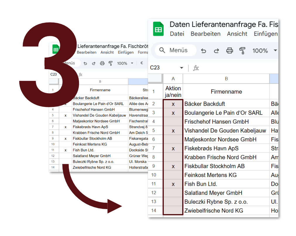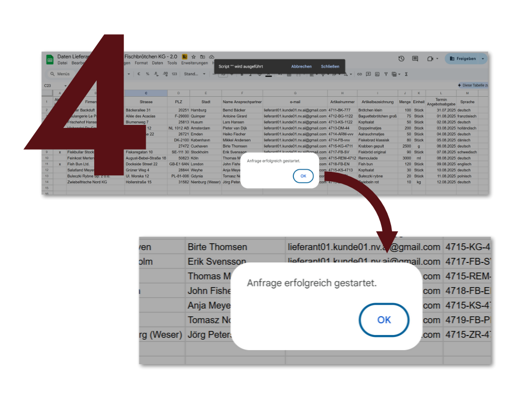 Es generiert auf Knopfdruck mehrsprachige, fertig formatierte E-Mails – basierend auf Lieferantendaten, die im Google Sheet eingegeben werden.