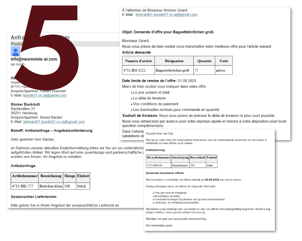 Mit einem Klick auf „Lieferantenanfrage“ erstellt das Tool automatisch individualisierte E-Mail-Anfragen – mehrsprachig (z. B. Deutsch, Englisch, Französisch, Niederländisch, Dänisch, Schwedisch, Polnisch, was Sie möchten) und im professionellen Geschäftsstil.