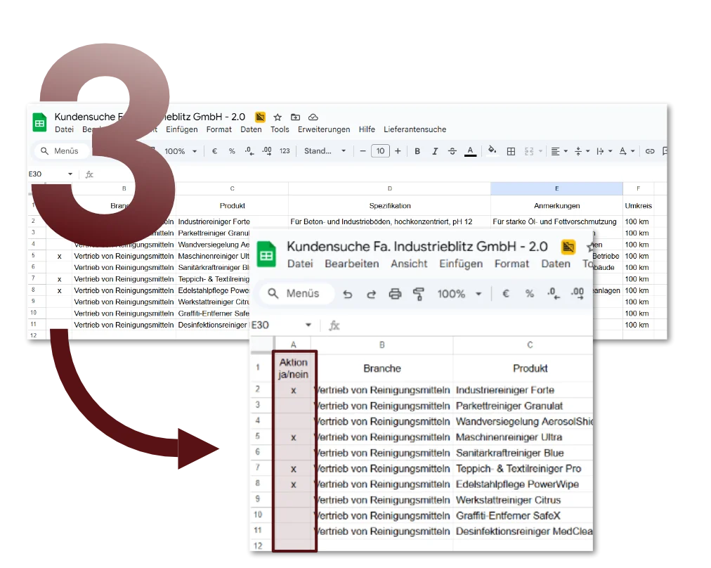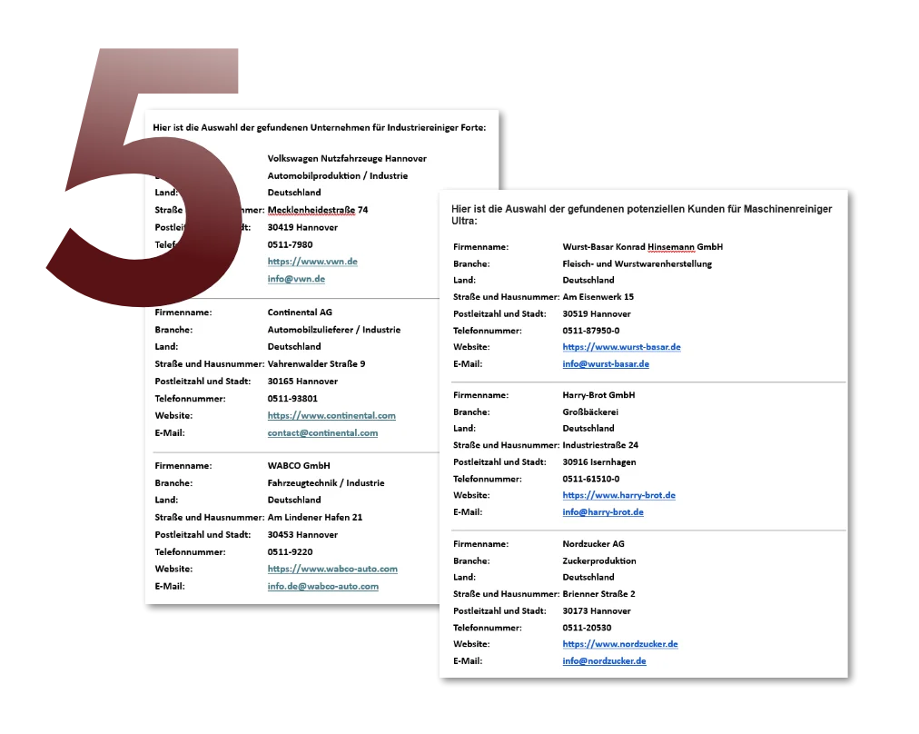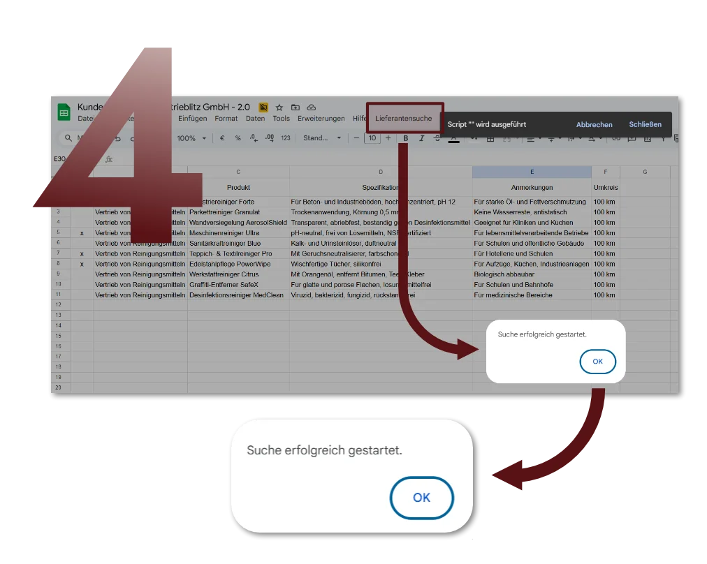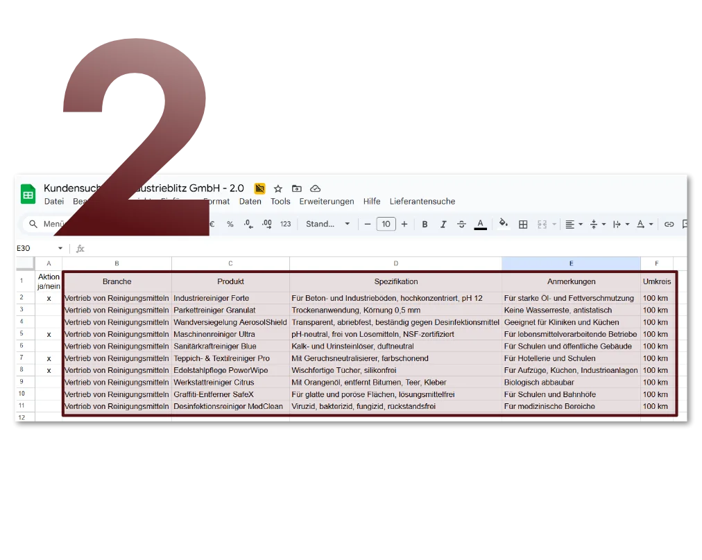Unser automatisiertes Tool zur Kundensuche unterstützt Sie dabei, gezielt neue Absatzmöglichkeiten für Ihre Produkte zu identifizieren – schnell, effizient und vollständig integriert in Google Sheets. Und das 14 Tage lang kostenlos zum Testen.